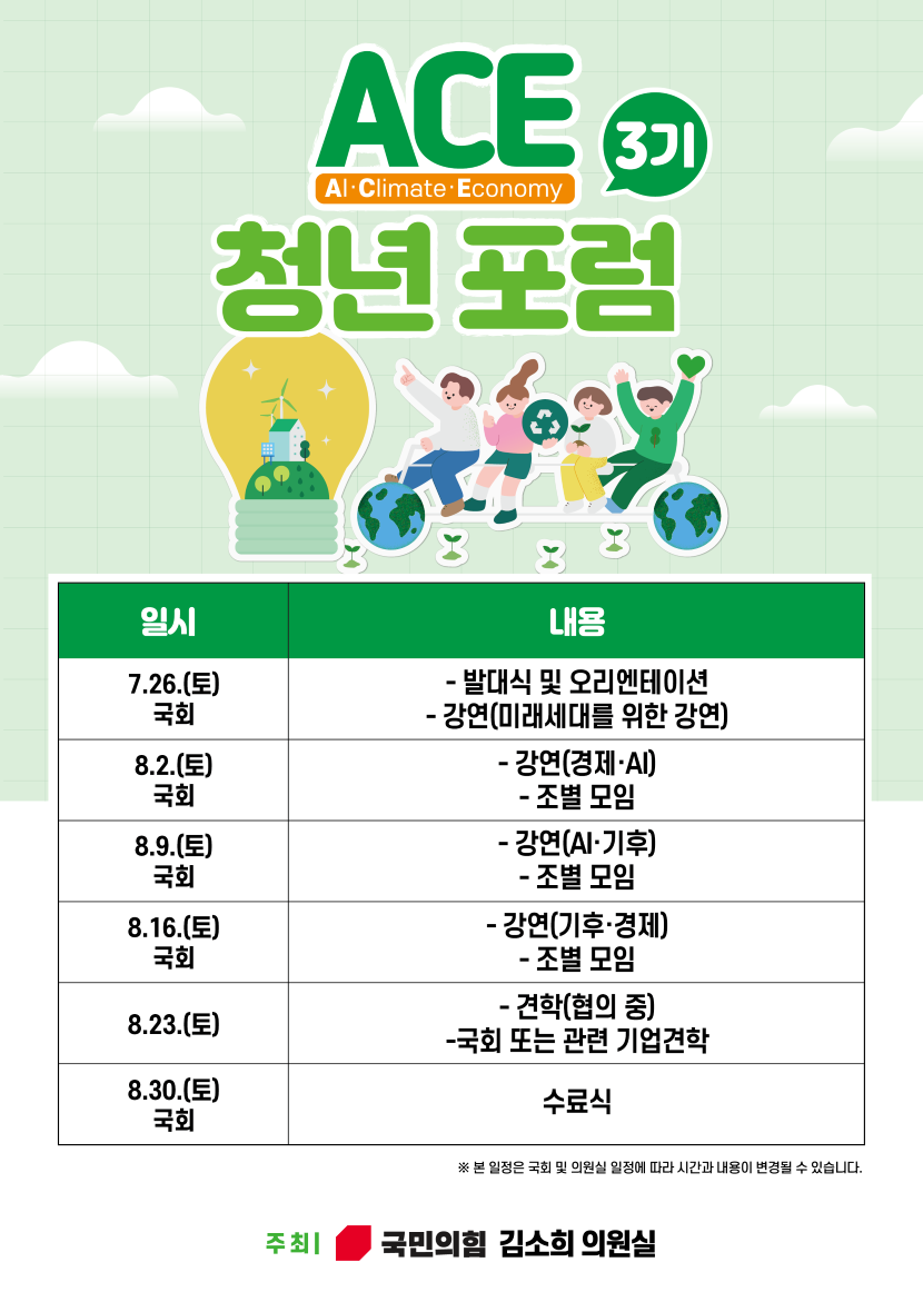 ACE 청년 포럼은 AI(인공지능), Climate(기후), Economy(경제)의 첫 글자를 따서 만들어졌습니다. 이 포럼은 청년들이 기후변화와 AI가 주도하는 경제의 중심에서 주체적으로 활약할 수 있도록 돕고자 시작되었습니다.