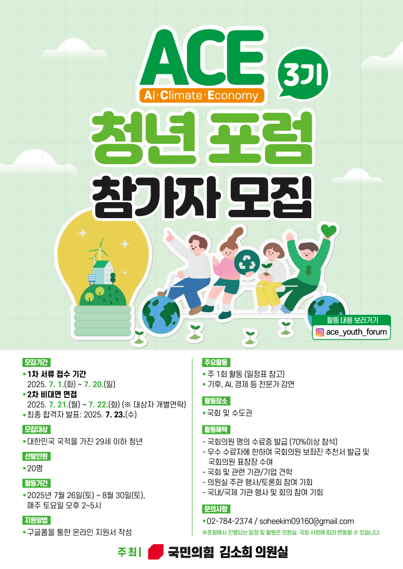 ACE 청년 포럼을 통해 청년들의 아이디어와 에너지가 우리나라의 지속 가능한 미래를 만드는 데 기여할 수 있기를 기대합니다. 여러분의 많은 관심과 참여를 기다립니다!